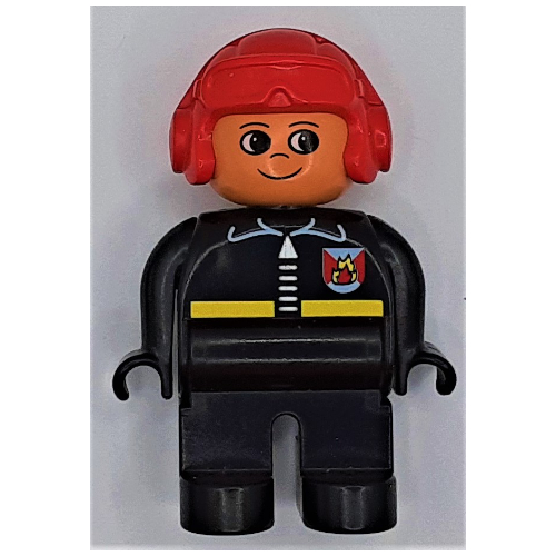 Duplo Figure, Early, Aviator Hat Red, Black Legs, Fire Jacket with Zipper Print |