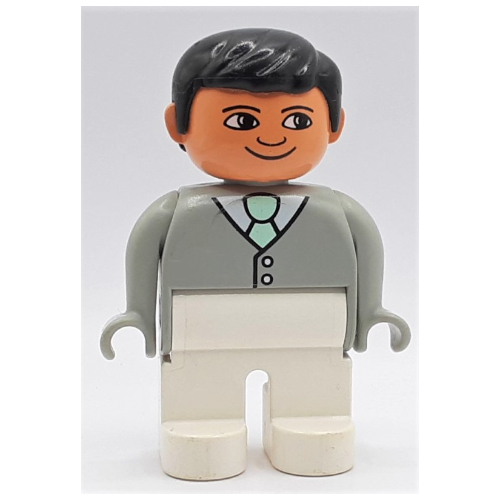 Duplo Figure, Early, with Short Parted Hair Black, White Legs, Buttons, Light Green Tie Print |