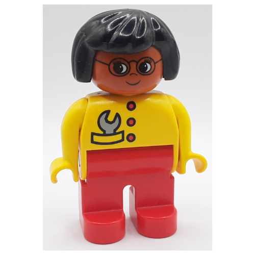 Duplo Figure, Early, Hair Bob Black, Red Legs, Red Buttons and Gray Wrench, Glasses Print |